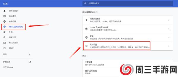 3、点击隐私设置和安全性,然后再单击右侧网站设置
