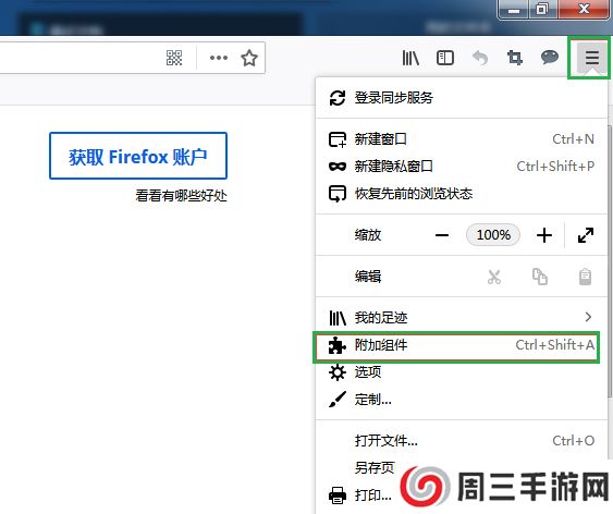 6、点击右上角菜单键,之后选择“附加组件”