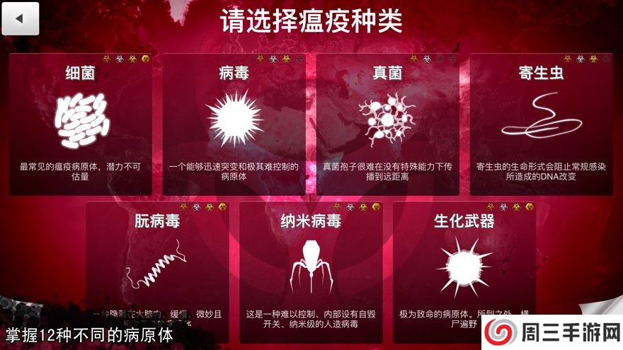 1. 选择病原体:在游戏开始时,玩家需要选择一种基础病原体,如细菌、病毒或真菌等。