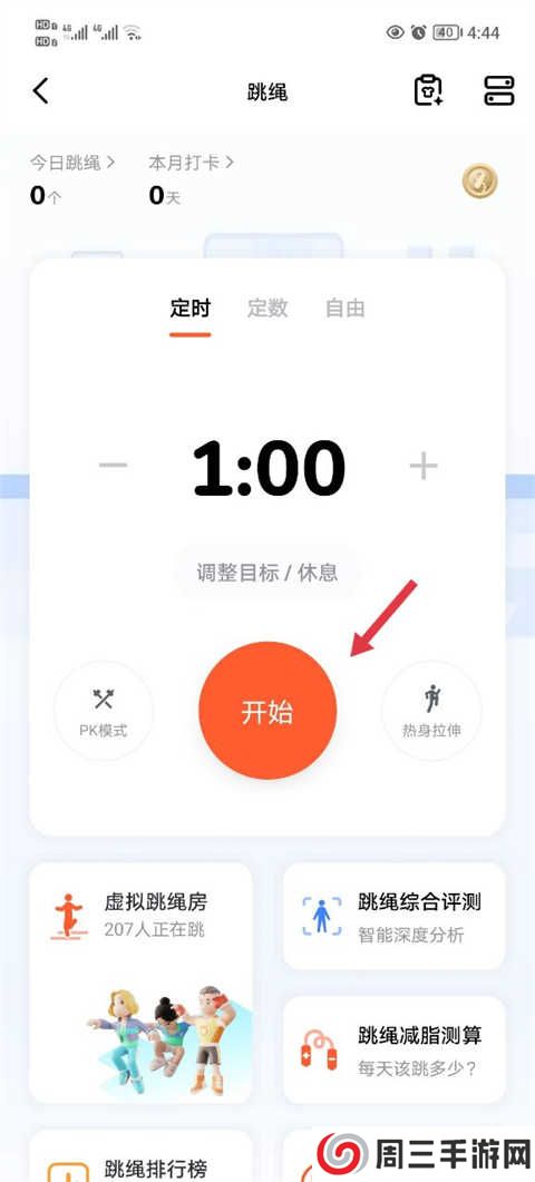 我们首先体验跳绳功能,点击【开始】会直接进入默认一分钟计数跳绳页,点击蓝色内容可进入跳绳设置界面。