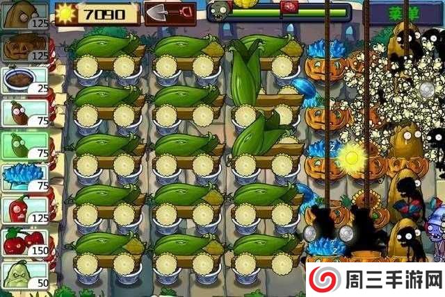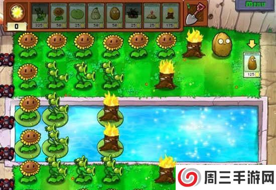 要点1:经济作物向日葵,水上必须放莲蓬,水路最后4格不会突然冒出僵尸,如果水上有钢帽子僵尸,此时你水路火力还薄弱,可以用墙国挡,也可以用25YG的海藻消灭。