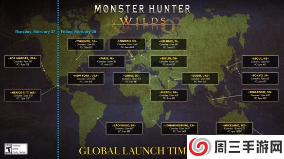 《怪物猎人:荒野(Monster Hunter Wilds)》官推发布了一张全球游戏发售时间图,玩家可以根据自己所在地提前做好准备,PC与主机端的游戏发布时间根据所在地不同,发售时间亦有不同。但是在这张发售时间地图上并没有中国的身影,大家只能参考日本/韩国的发售时间。