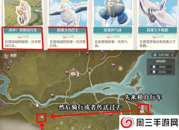 1、首先去租借一辆自行车,然后骑行或传送到浮絮巨鸥的巢穴。