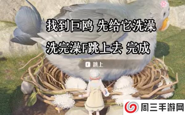 2、找到巨鸥,接着给它洗澡,洗完之后跳上去。