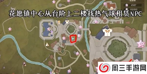 3、花园镇中心从台阶上二楼找热气球租借NPC。