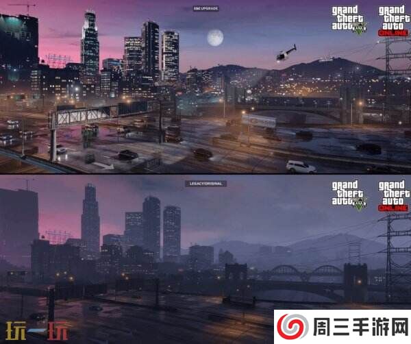 从对比图片中,尽管两张图呈现的天气状况有所差异,但照明、阴影以及环境光遮蔽方面的升级清晰可见。特别是汽车灯光在夜间的表现更为突出,能够更有效地照亮道路,增强了游戏的真实感与沉浸感。同时,更新后的光线渲染距离也大幅提升,图中的月亮仿佛充当了主要的光线追踪全局照明光源,使得场景光照效果更加自然逼真。